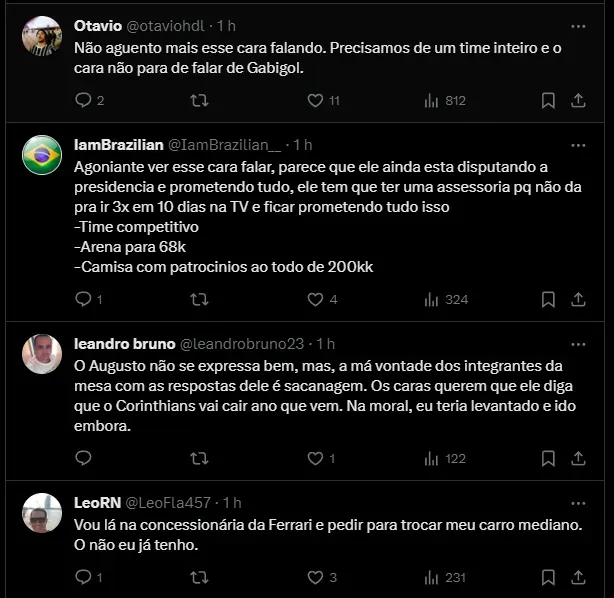 “O Corinthians precisa de 10 a 12 contratações. E sempre falei, na minha campanha, o Corinthians terá o maior choque de gestão de sua história, nos já estamos trabalhando para isso“, comentou Augusto Melo na ESPN.