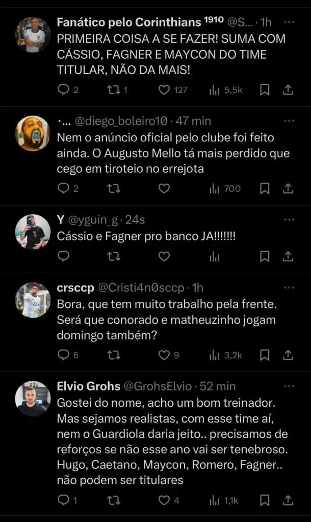 O interino também falou sobre a chegada do novo treinador: “Convívio vai ser o melhor possível. Conheço de enfrentá-lo, é um grande profissional, não à toa foi convidado pelo Corinthians . Espero que ele nos ajude, vai ser uma peça importante nesse cenário. Vamos fazer o máximo possível para ajudá-lo, para que ele conheça o elenco rapidamente. Que a gente possa recolocar o Corinthians no caminho certo de novo.”