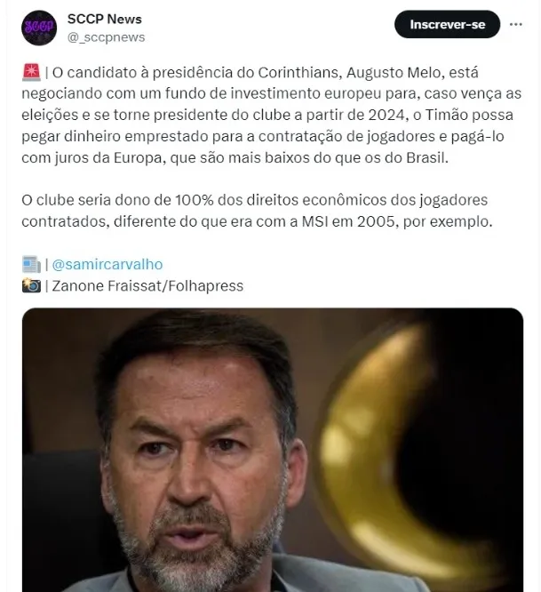 O candidato à presidência do Corinthians, Augusto Melo, está negociando com um fundo de investimento europeu para, caso vença as eleições e se torne presidente do clube a partir de 2024, em disputa com outras chapas. Se tudo der certo em seu plano, a expectativa é de que o Timão possa pegar dinheiro emprestado para a contratação de jogadores e pagá-lo com juros da Europa, que são mais baixos do que os do Brasil, o que poderia ajudar também na quitação.