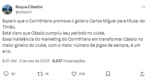 Desse modo, nas redes sociais, muitos corintianos tem feito pedidos ao técnico Mano Menezes para dar mais oportunidades para o goleiro reserva. Entretanto, o Corinthians tem apenas mais um jogo pelo Brasileirão.