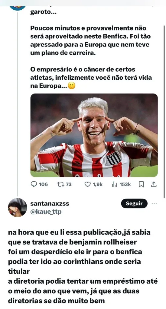 Benjamín Rollheiser esteve na mira do Alvinegro no início desta temporada, destaque do Estudiantes, o jogador despertou interesse em Augusto Melo para reforçar o elenco. O jogador era visto como uma nova estrela ideal para o time a ser montado pela atual gestão.