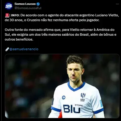 Em vídeo publicado no canal do YouTube do jornalista, foi exposto que o staff do experiente atacante argentino confirmou de forma categórica que não teve nenhuma proposta do Cruzeiro para uma negociação.