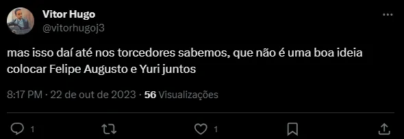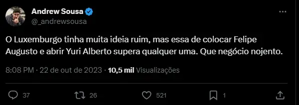 “O Luxemburgo tinha muita ideia ruim, mas essa de colocar Felipe Augusto e abrir Yuri Alberto supera qualquer uma. Que negócio nojento”, “Mudaram de técnico tarde, o Mano ta conhecendo o que pode e o que não pode fazer quase na 30° rodada” e “isso daí até nos torcedores sabemos, que não é uma boa ideia colocar Felipe Augusto e Yuri juntos”, foram alguns dos comentários.