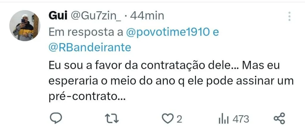 Apesar disso, o presidente afirmou que apenas citou o jogador e apontou um entrave para um possível acerto. “Estou só citando um exemplo, porque tem contrato e o salário dele é muito alto, mas é um jogador que gosto.”, continuou.