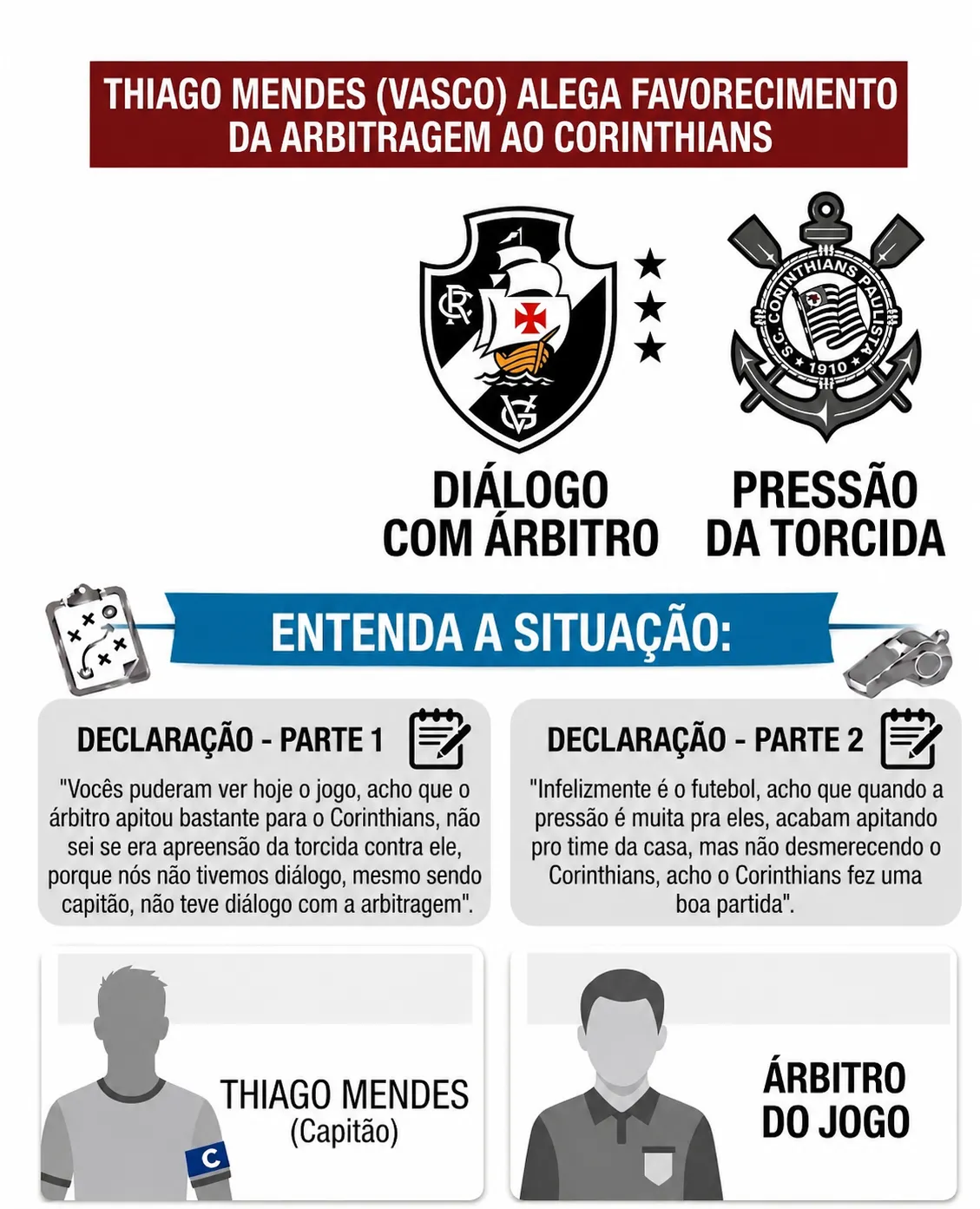 Durante uma entrevista dada pós-jogo, Thiago Mendes, do Vasco, alegou que a arbitragem teria, de certa forma, favorecido o Corinthians na Neo Química Arena, atrapalhando bastante a busca dos cariocas pelo empate: