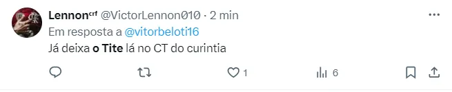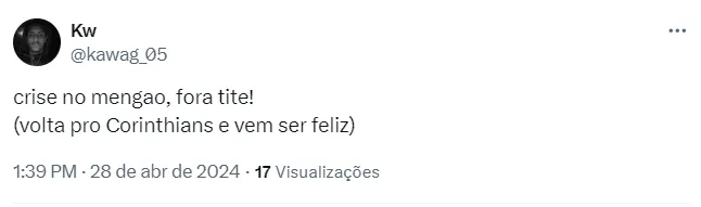 Na internet, um torcedor comentou (SIC): “Crise no Mengão, fora Tite! (volta pro Corinthians e vem ser Feliz)”. Já um torcedor do Flamengo resmungou: “Já deixa o Tite lá no CT do Corinthians”.