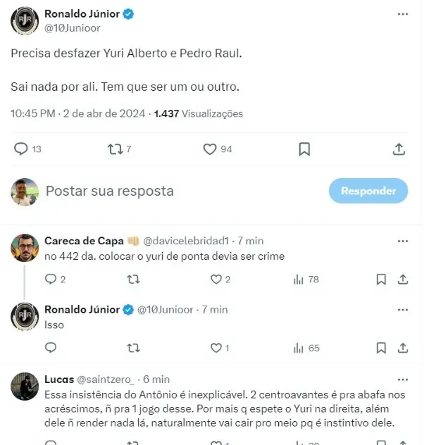 “Pedro Raul e Yuri Alberto juntos não dá, é um ataque morto e totalmente improdutivo”, disse outro internauta. “Só faz sentido ajustar o time com Yuri Alberto de ponta se o atacante for muito bom… Pedro Raul está longe de ser esse cara”, disse outro.