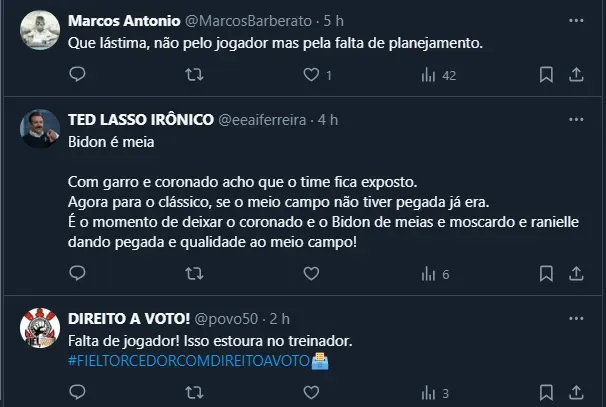 Isto é, como restam apenas mais cinco jogos para o meio-campista ir em definitivo para a França, a falta de planejamento do Timão ficou escancarada. Até por isso, os torcedores resolveram criticar novamente a gestão atual.