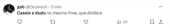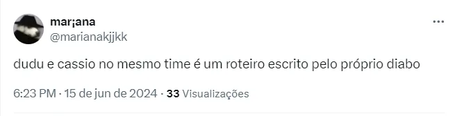 “Dudu e Cássio no mesmo time é um roteiro escrito pelo próprio diabo”, comentou um dos torcedores na internet. Um outro escreveu: “Cássio e Dudu no mesmo time, que doidera”.