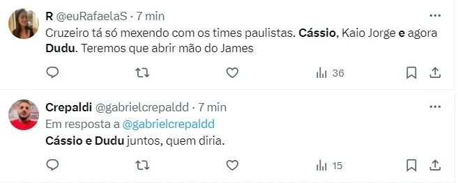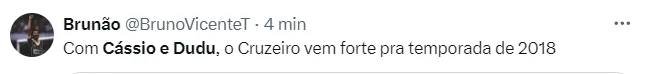 Já um outro torcedor do Bando de Loucos pontuou: “Com Cássio e Dudu, o Cruzeiro vem forte para 2018”. Já um outro integrante da Fiel torcida deixou sua opinião: “Cássio e Dudu juntos, quem diria”.