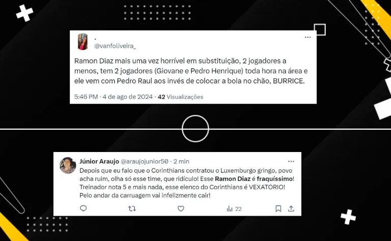 Na web, os corinthianos criticaram o treinador: “Esse Ramon Diaz é fraquíssimo! Treinador nota 5 e mais nada”, apontou um torcedor (veja outros comentários abaixo). O técnico argentino fez o seu sexto jogo pelo Timão, com duas vitórias, três empates e uma derrota.