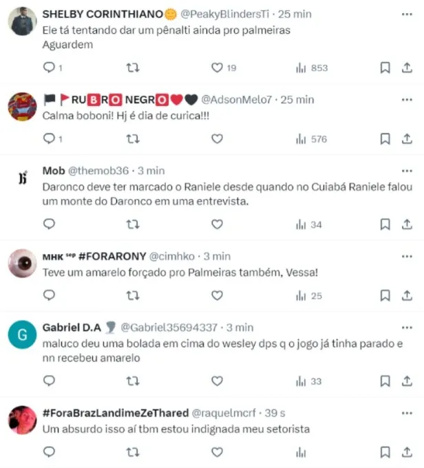 “Outra falta em cima do Wesley e nada de cartão pros cara… Esse timeco do palmeiras pode bater a vontade todo jogo, inacreditável como são favorecidos“, escreveu um torcedor no X.