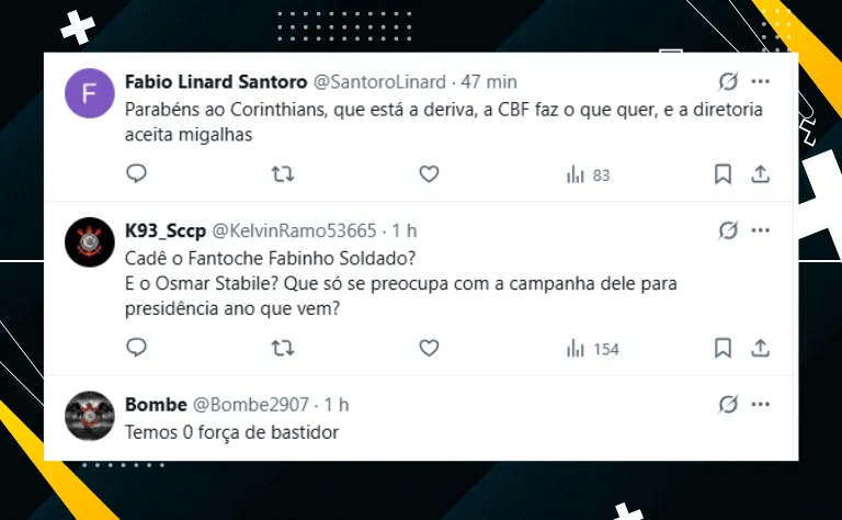 Isto é, diversos torcedores do Timão criticaram a falta de organização e o “bom trabalho” que a diretoria tem feito. Fabinho Soldado e Osmar Stabile tiveram seus nomes envolvidos nas críticas.