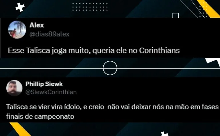 “Róger guedes chegaria para ser o racha no elenco, porque vai querer ser a estrela. Não vejo a vinda dele como algo positivo, muito pelo contrário. Talisca seria melhor do que ele”, publicou mais um. “Prefiro ele que o Roger, além de ser mais fácil de trazer por já estar de saída do futebol árabe. Talisca no Corinthians seria sensacional, um BAITA reforço. Alô Esportes da Sorte!”, escreveu outro corintiano.