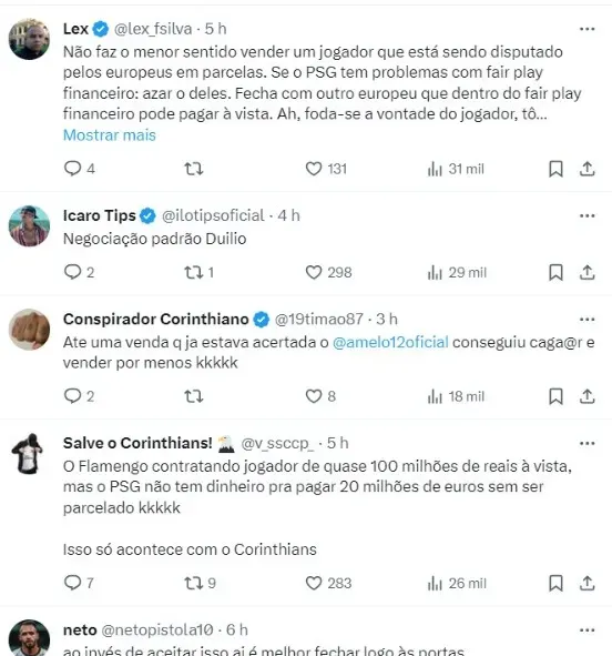 “Valor começou em 25 mi de euros. Foi pra 23 mi de euros + 2 mi bônus Agora 20 mi de euros + 2 mi bônus. Daqui apouco a gente descobre que é tudo por 20 mi. E depois a gente descobre que é por 20 mi de dólares e que o Corinthians terá direito a menos da metade do valor“, disse outro Fiel.