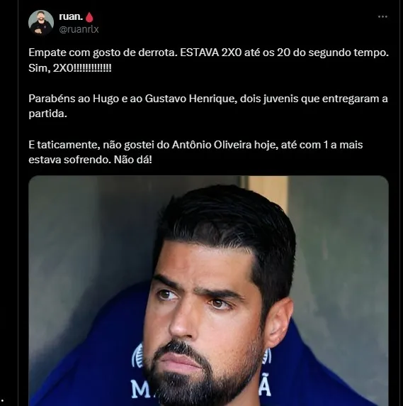 O torcedor Presida comentou sobre os principais culpados pelo empate fora de casa: “Os maiores culpados por esse empate com gosto de derrota: António Oliveira, Hugo e Gustavo Henrique.