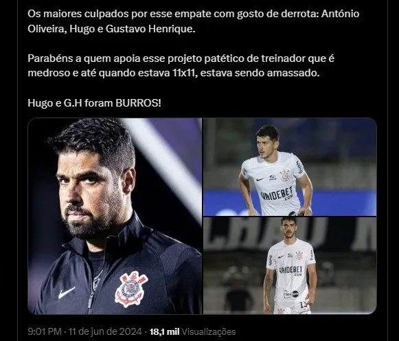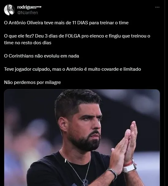 O Corinthians empatou em 2 x 2 contra o Atlético-GO pela 8a rodada do Campeonato Brasileiro. Após a partida vários torcedores do Timão criticaram a postura do time durante a partida e um dos alvos foi António Oliveira.