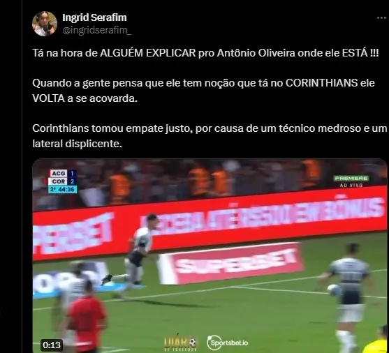 A torcedora Ingrid Serafim, ficou revoltada com a postura do treinador no empate “Tá na hora de ALGUÉM EXPLICAR pro Antônio Oliveira onde ele ESTÁ !!!