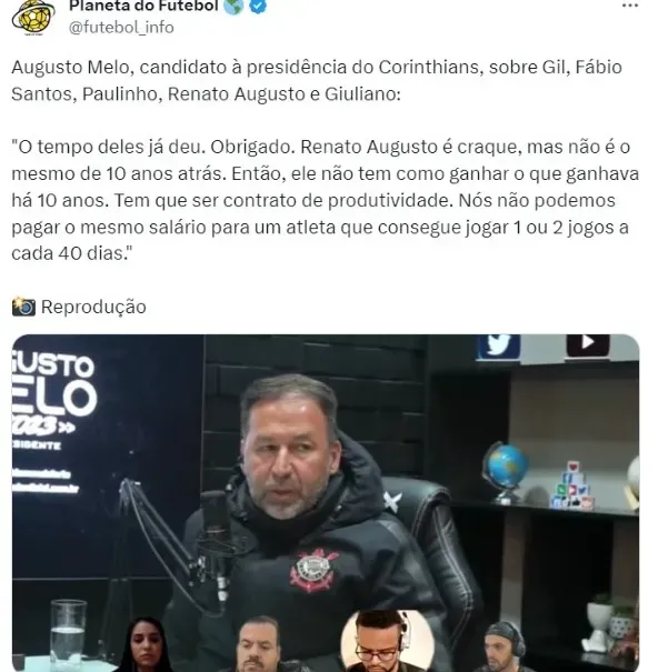 Além disso, na quarta-feira passada, o candidato da oposição à presidência do Corinthians esteve envolvido em outras controvérsias. O seu perfil oficial no Instagram fez uma transmissão ao vivo para os seguidores e fez críticas ao lateral-esquerdo Fábio Santos durante o jogo contra o Fortaleza, pela Sul-Americana, chamando-o de “podzinho eletrônico”.