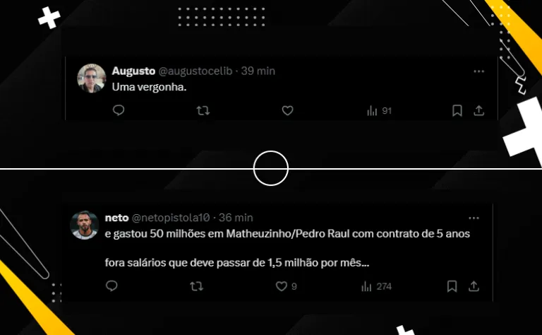 “Augusto Melo pagou R$ 25 milhões na contratação de Pedro Raul, o presidente também é culpado“. “Parabéns ao Augusto Melo, que fica apenas prometendo contratações com nomes improváveis e no fim não fecha com ninguém“, comentou outro torcedor.