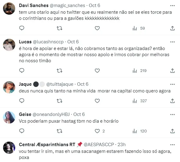 Nas redes sociais, a maioria dos torcedores apoiou os protestos como uma maneira legítima de expressar suas preocupações em relação ao clube. No entanto, algumas vozes questionaram os métodos adotados pela Gaviões da Fiel, sugerindo abordagens mais construtivas para a resolução dos problemas enfrentados pelo Corinthians.