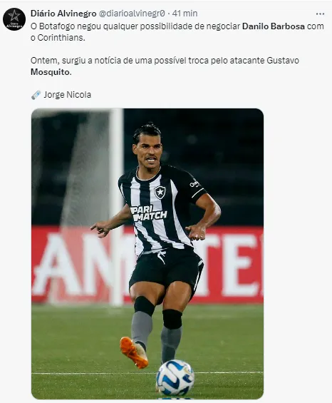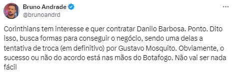 “Corinthians tem interesse e quer contratar Danilo Barbosa. Ponto. Dito isso, busca formas para conseguir o negócio, sendo uma delas a tentativa de troca (em definitivo) por Gustavo Mosquito”, iniciou o jornalista.