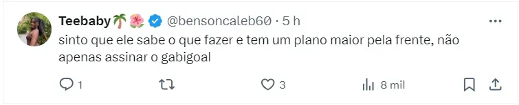 “Eu sempre deixei claro que o Gabigol tem a nossa cara, tem nossas características, é um grande jogador, por onde passou foi artilheiro”, completou. O presidente ainda destacou que tinha acertado tudo, mas a demora para finalizar a negociação fez com que desistisse do negócio.
