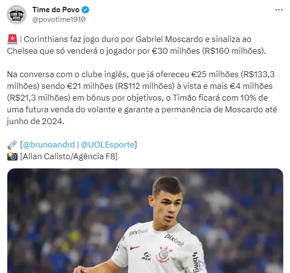 Mas o mercado da bola tem chamado a atenção nos bastidores do Parque São Jorge. Isso porque os olhares do Chelsea estão todos voltados para o jovem Gabriel Moscardo. Que pode deixar o Clube ainda nessa janela, se o clube inglês fazer o que o Corinthians pede.