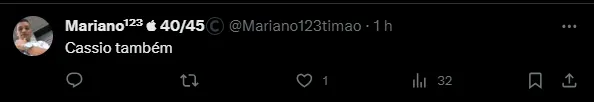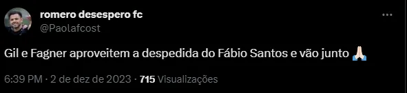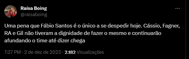 “Fábio Santos pode dar um tapa no Fagner e do Cássio e avisar que já tá na hora deles se aposentarem?” e “Uma pena que Fábio Santos é o único a se despedir hoje. Cássio, Fagner, RA e Gil não tiveram a dignidade”, foram comentários.