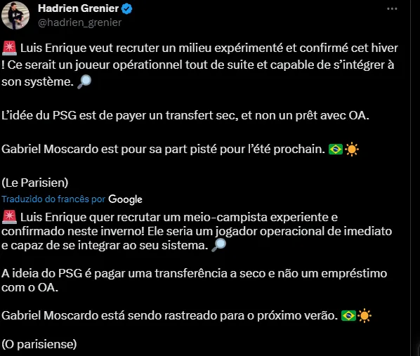 Neste sábado (16), o técnico Luís Enrique concedeu entrevista coletiva e foi perguntado sobre a chegada de alguns reforços para a equipe parisiense, dentre eles Gabriel Moscardo.
