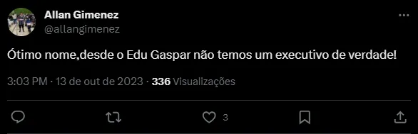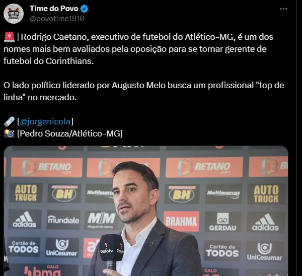 No entanto, segundo o portal, Caetano não deve ir para o Corinthians. Isso porque até agora não houve contato algum de qualquer candidato ao cargo de presidente no Time do Povo nos próximos três anos. Vale destacar que, no ano passado, o profissional renovou o seu vínculo até o fim de 2026 com o clube mineiro, onde vem fazendo um trabalho de certa forma positivo em Minas Gerais.