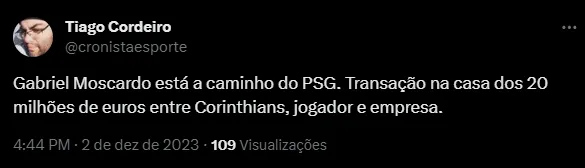 “Gabriel Moscardo está a caminho do PSG. Transação na casa dos 20 milhões de euros entre Corinthians, jogador e empresa”, escreveu Thiago Cordeiro nas redes sociais, sando mais detalhes sobre o assunto.