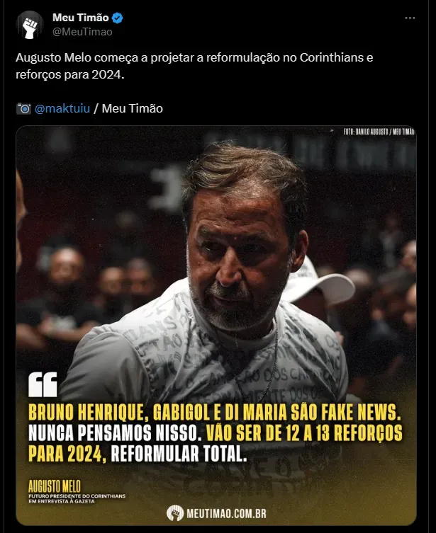 “Bruno Henrique, Gabigol e Di María são fake news. Nunca pensamos nisso. Vão ser de 12 a 13 reforços para 2024. Reformular total”, afirmou Augusto Melo em entrevista para a Gazeta Esportiva.