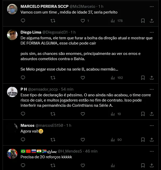 Melo ainda fez questão de reforçar que acontecerá uma reformulação e que a ideia do Corinthians é montar um elenco bem competitivo. Ele ainda criticou o atual plantel, destacando que o banco atual não é bom.