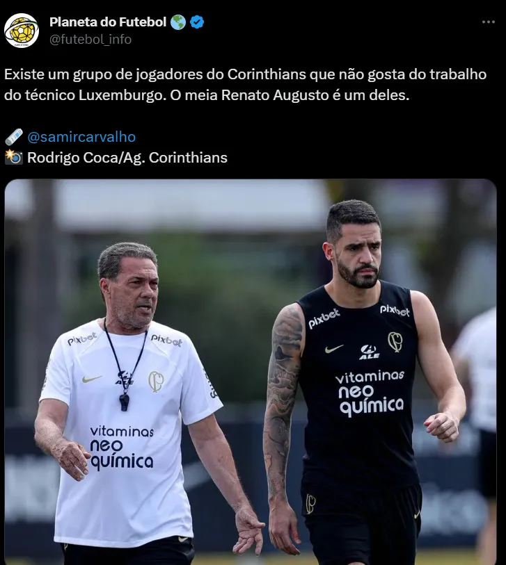 Conforme informação de Samir Carvalho, o meio-campista Renato Augusto faz parte do grupo de jogadores que não estão gostando do trabalho dele no Timão. O atleta é uma das referências técnicas do grupo atual da equipe paulista e está em processo para renovar seu contrato.