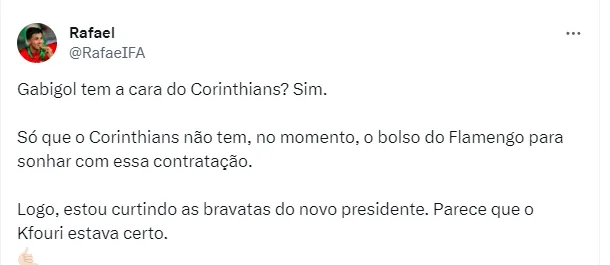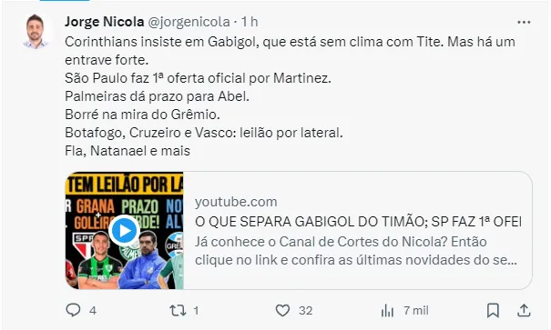 “Corinthians quer mesmo Gabigol, com há alguns dias atrás revelou o Craque Neto. Gabigol vê a possibilidade de jogar no Corinthians com bons olhos”, afirmou Nicola, confirmando a informação inicial.