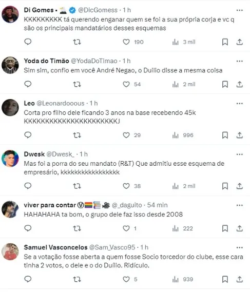 No caso de André Negão, durante uma entrevista dada sobre o que projeta caso vença a votação, foi questionado sobre a participação de empresários ‘colocando’ jogadores no Timão, mas deixou claro que não vai aceitar: