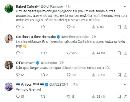 “Os dois clubes fizeram a mesma proposta ao Fla pelo lateral, mas o Rubro-Negro não quer fazer negócio com o Timão (por conta da condução dos paulistas no caso envolvendo Matheuzinho, com direito a nota oficial)”, prosseguiu.