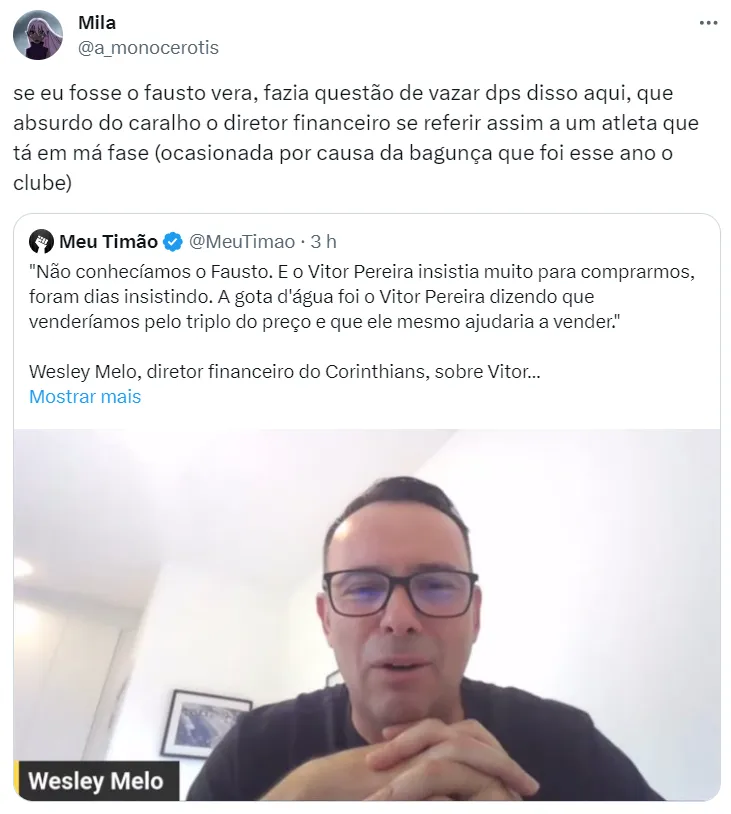 Em entrevista ao portal Meu Timão, o diretor financeiro do Corinthians, Wesley Melo, falou sobre as pendências nos repasses e os problemas financeiros do caso Fausto Vera.