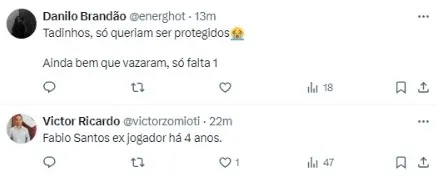 “O Fábio não tem histórico de ser traíra, de derrubar treinador, de fazer panelinha ou fofoca por trás para criar um clima ruim. O Fábio não tem esse histórico. Então, chamar o cara de covarde lá de Portugal, sei lá onde ele está, eu acho bem complicado. Os caras falaram que ele não era de grupo, ele estava aqui”, salientou.