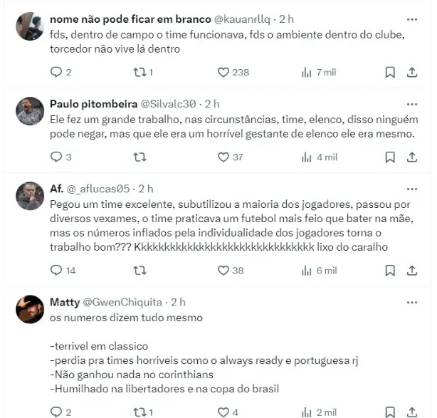 O treinador ainda se defendeu de críticas ao trabalho no Corinthians. Segundo ele, os resultados foram bons, o que te coloca em uma posição de uma avaliação positiva dos oito meses em que esteve à frente do clube paulista.