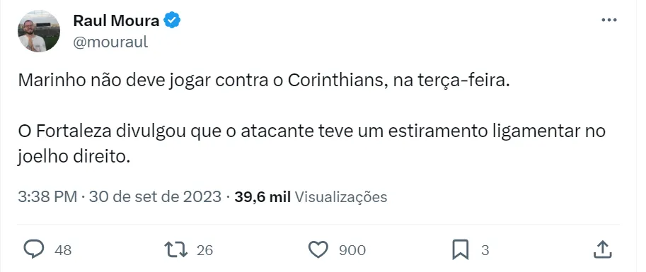 Marinho chegou ao Leão no meio da temporada, após passagem decepcionante no Flamengo. Na Sul-Americana, o atacante de 33 anos tem dois gols e duas assistências. Ele marcou o gol da classificação às quartas de final da Sula, contra o Libertad, do Paraguai. Com desfalque de peso no adversário de terça-feira (3), o Corinthians pode tentar tirar proveito da situação para se classificar à final da competição continental.