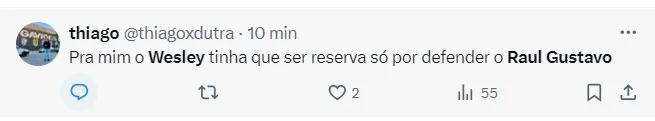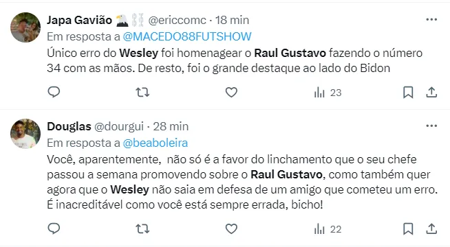 “Raul Gustavo é meu irmão, muito chateado pelo o que aconteceu na terça, as pessoas falam como se ele fosse uma pessoa briguenta, sou amigo dele, sei o bom coração que tem, as pessoas julgam sem conhecer. Foi uma homenagem para ele, obrigado meu irmaozão, tem amo“, falou Wesley.
