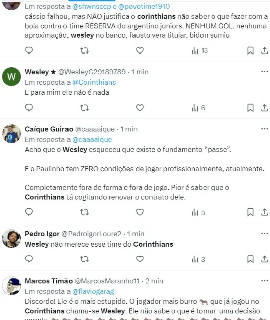“O Corinthians, sem Wesley, é um time inerte. Não acontece absolutamente NADA. Depende 100% de um garoto de 19 anos que ainda oscila – bem natural pela idade. Pobre de ideias“, disse um torcedor.