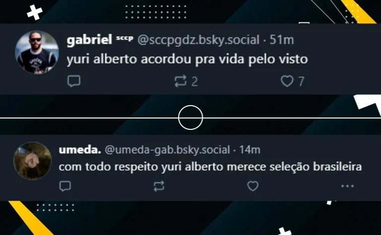 Na rede social Bluesky, um corintiano postou: “Na moral, o Yuri Alberto jogou muito…Ramón achou a posição dele. Tem que melhorar o domínio, mas está claramente jogando muito melhor. Fico feliz desse cara estar melhorando, sei lá… Gosto dele”.