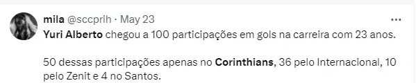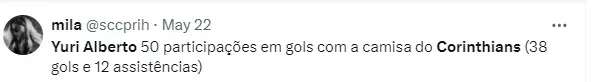 Em 2022, o centroavante foi para o Corinthians e está no clube paulista até hoje. No Coringão o jogador vive altos e baixos. Neste ano, ele está se destacando numa fase artilheira. O atacante chegou a 25 gols na Arena Corinthians e está somente a sete de alcançar Romero como o maior artilheiro do Estádio. Yuri Alberto precisa de mais sete gols para igualar a sua temporada mais goleadora.