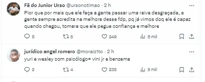 Yuri ainda disse que esse momento foi bem complicado e que ficou chateado de não estar rendendo o que era esperando no Timão. Por um lado otimista, nos últimos três jogos, ele balançou as redes duas vezes.