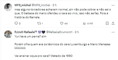 Para enfatizar a situação, ele finalizou sua fala sobre a polêmica, relembrando que dias antes tinha falado de outro jogador do elenco. Na ocasião relatada pelo ex-treinador do Timão, ele acabou cornetando Raniele e isso deu o que falar pela maneira que foi dito e por ter citado outro Clube.