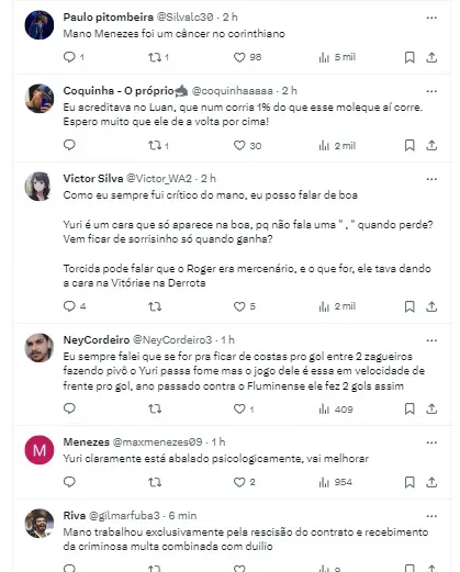 “Tava muito chateado. Não sou uma máquina, lógico que sinto, tenho sentimentos. No final, se transforma em raiva. A chateação desanima, a raiva te motiva. Queria mostrar que tinha a capacidade de entregar o que entreguei quando cheguei. Foram momentos difíceis que passei, muita humilhação, à minha família também”, finalizou Yuri Alberto.