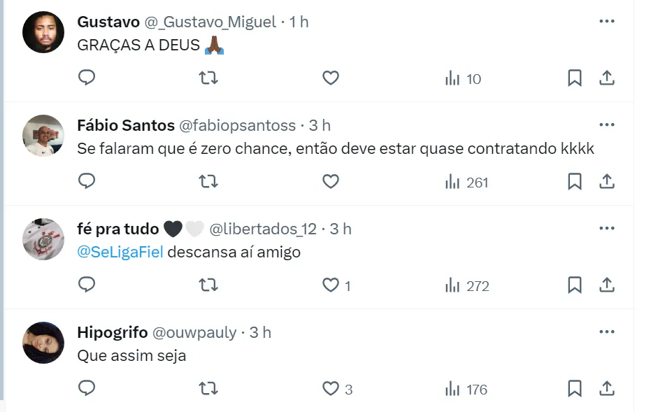 “Conversei com uma pessoa do Corinthians e me falou: zero chance. O que me foi passado que é zero chance. O Corinthians não quer retomar algo que fez muito mal ao clube na temporada passada”, disse o repórter do Jogo Aberto.
